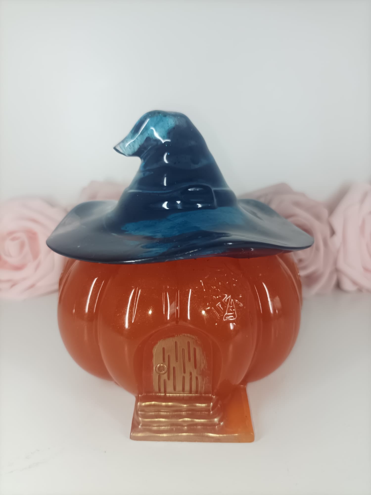 Boite décorative en forme d'habitation citrouille et son toit chapeau de sorcière.