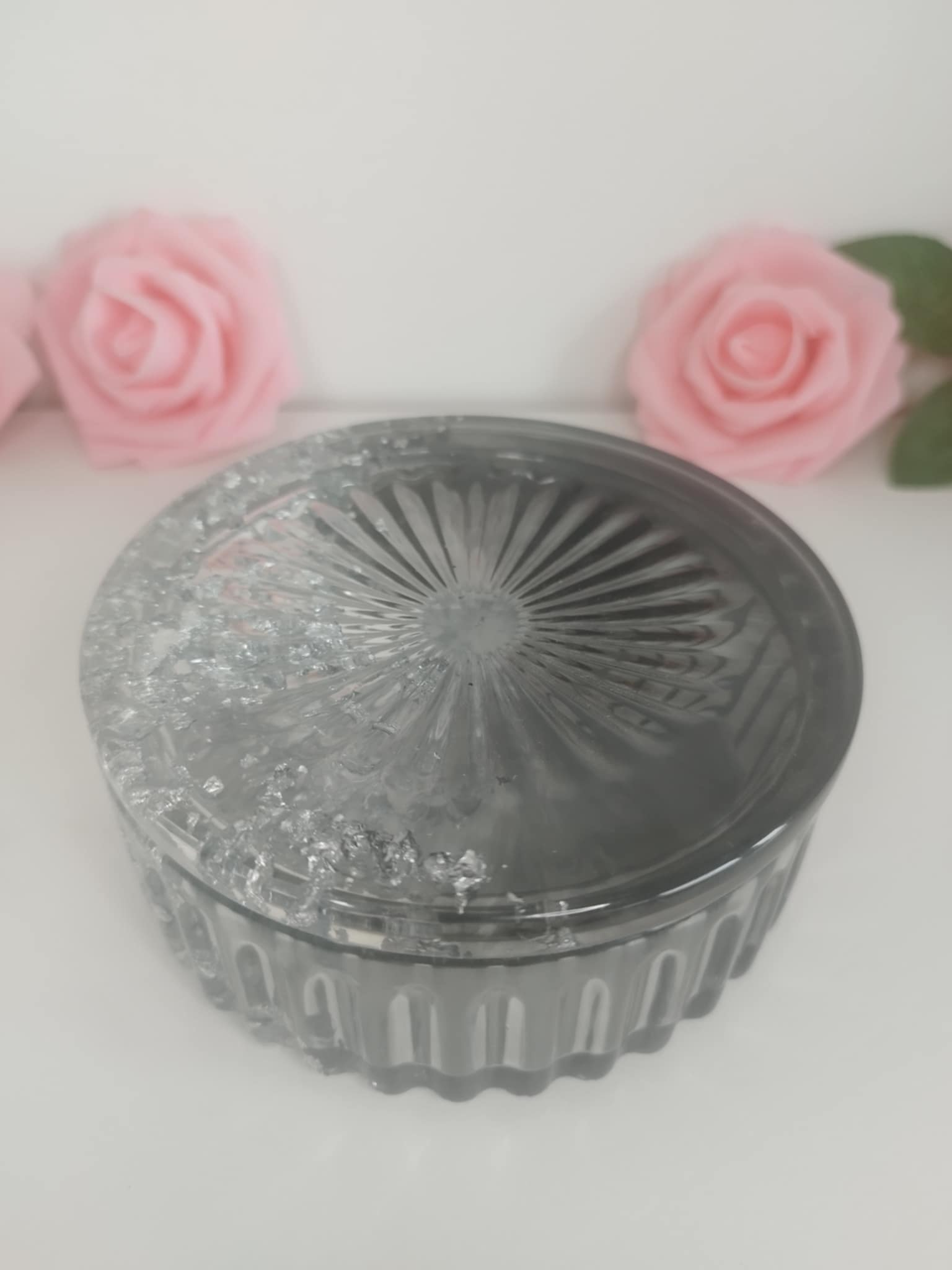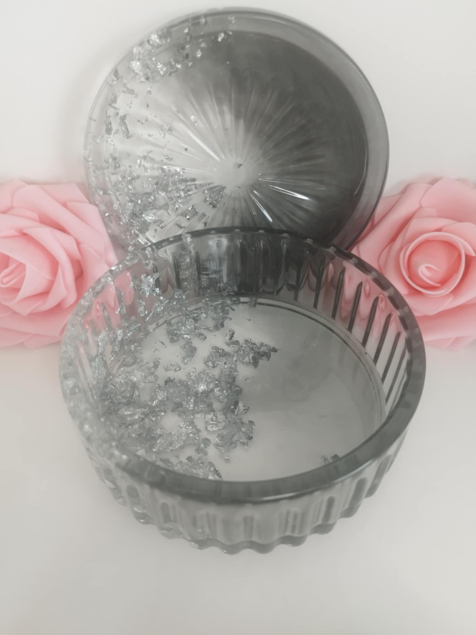 Boite rosace en résine époxy noire transparente et feuilles d'argent.