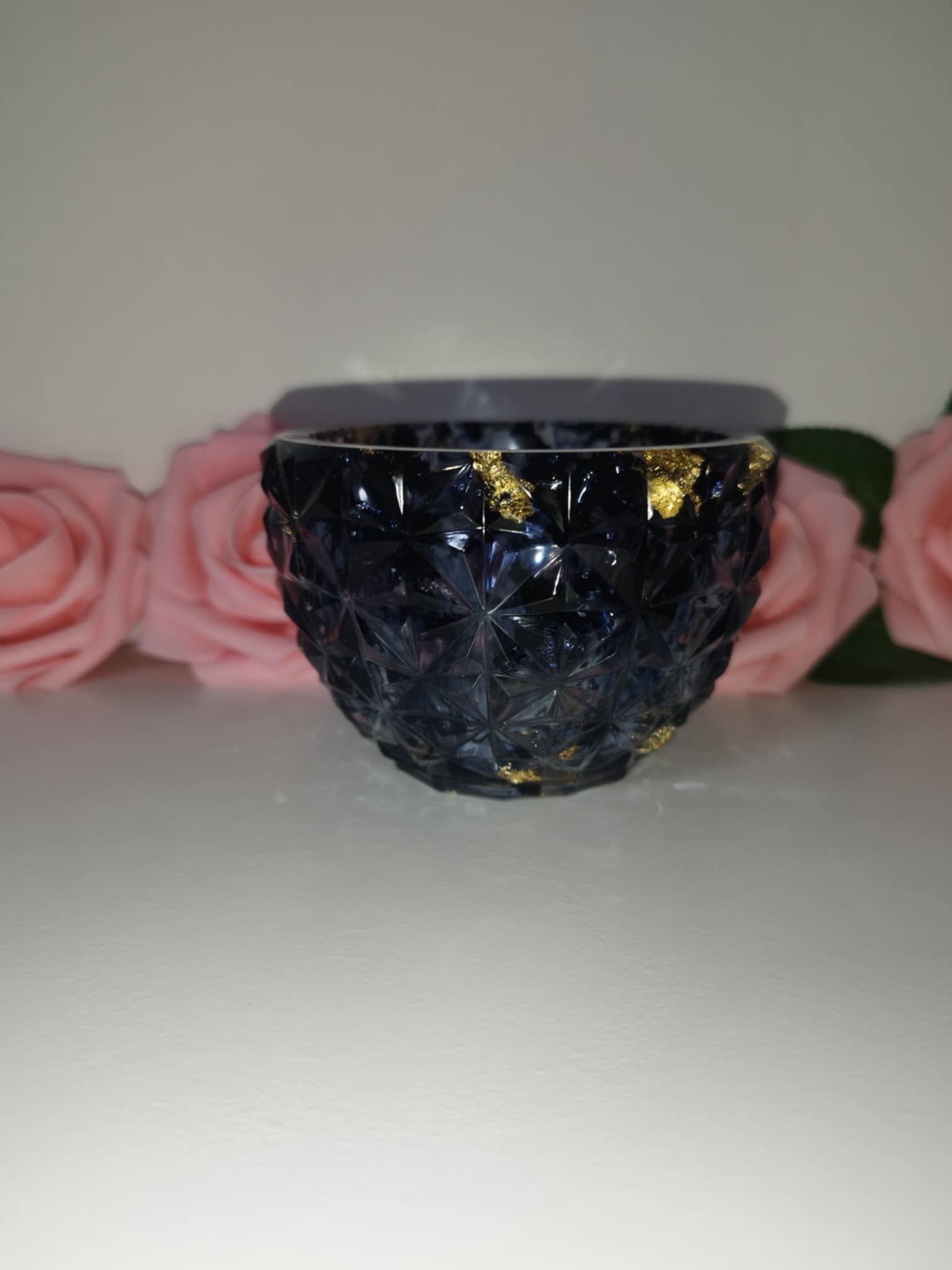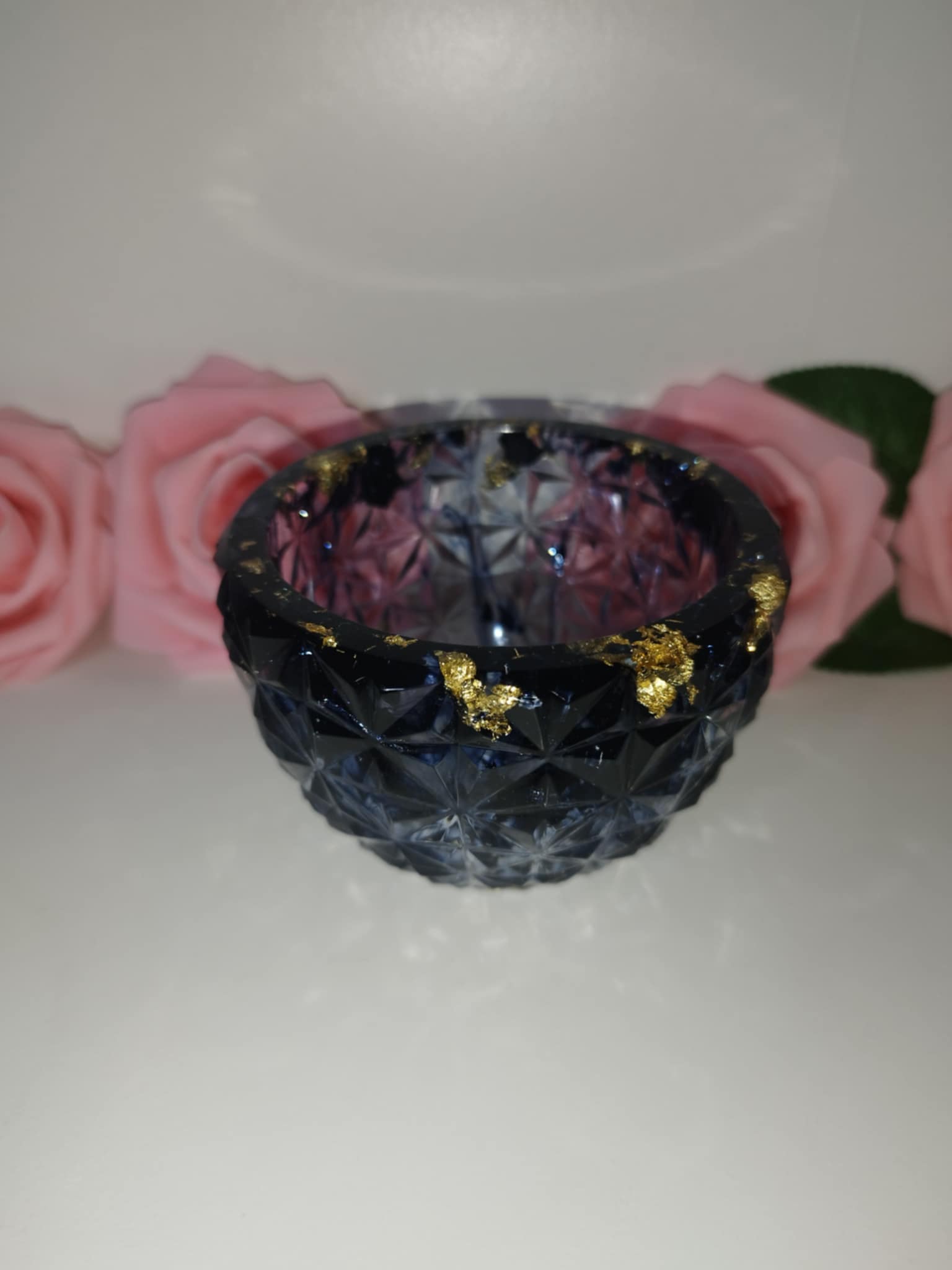 Petit bol en résine époxy effet cristal, feuilles d'or et feuilles noires.
