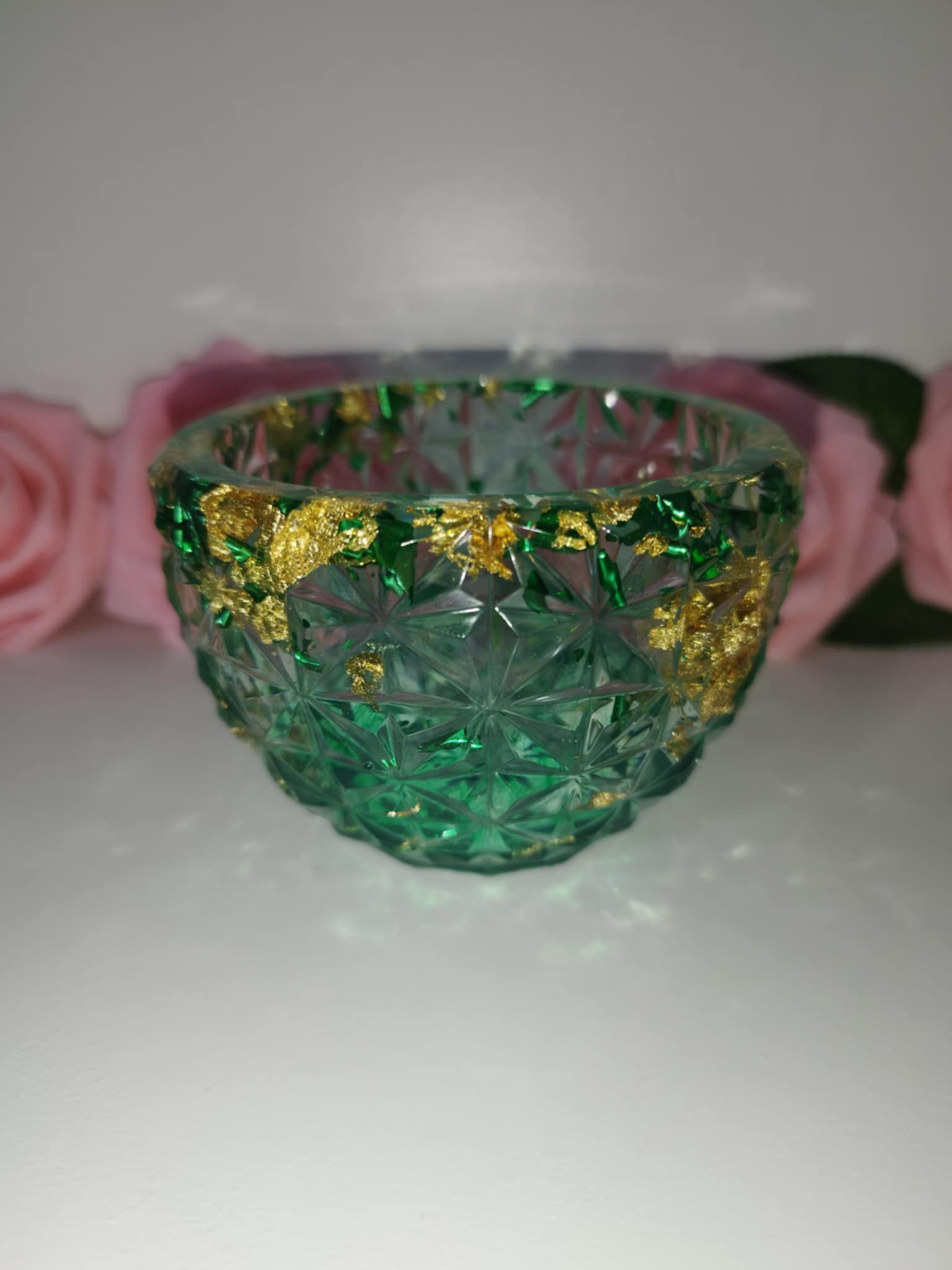 Petit bol en résine époxy effet cristal, feuilles d'or et feuilles vertes.