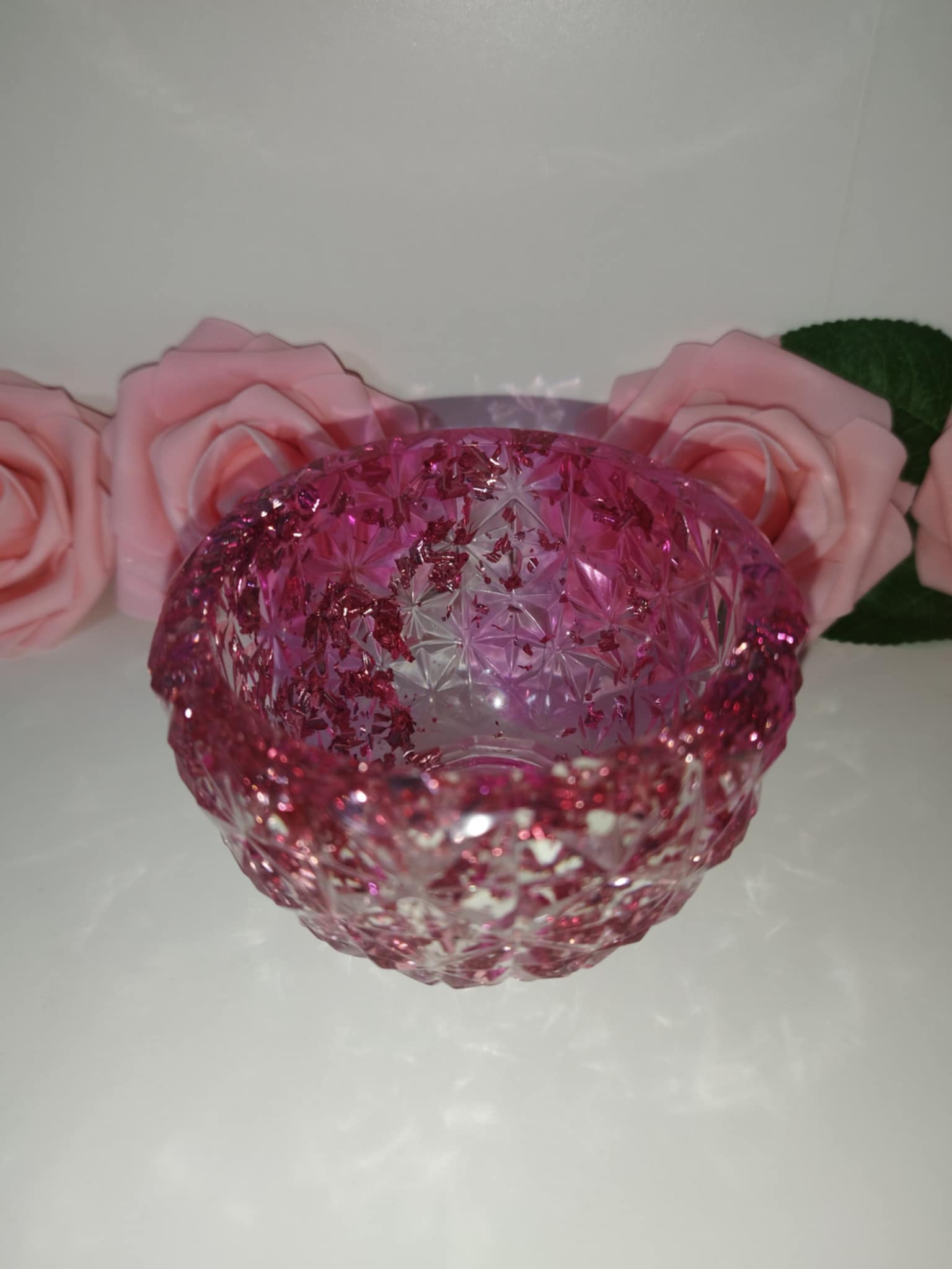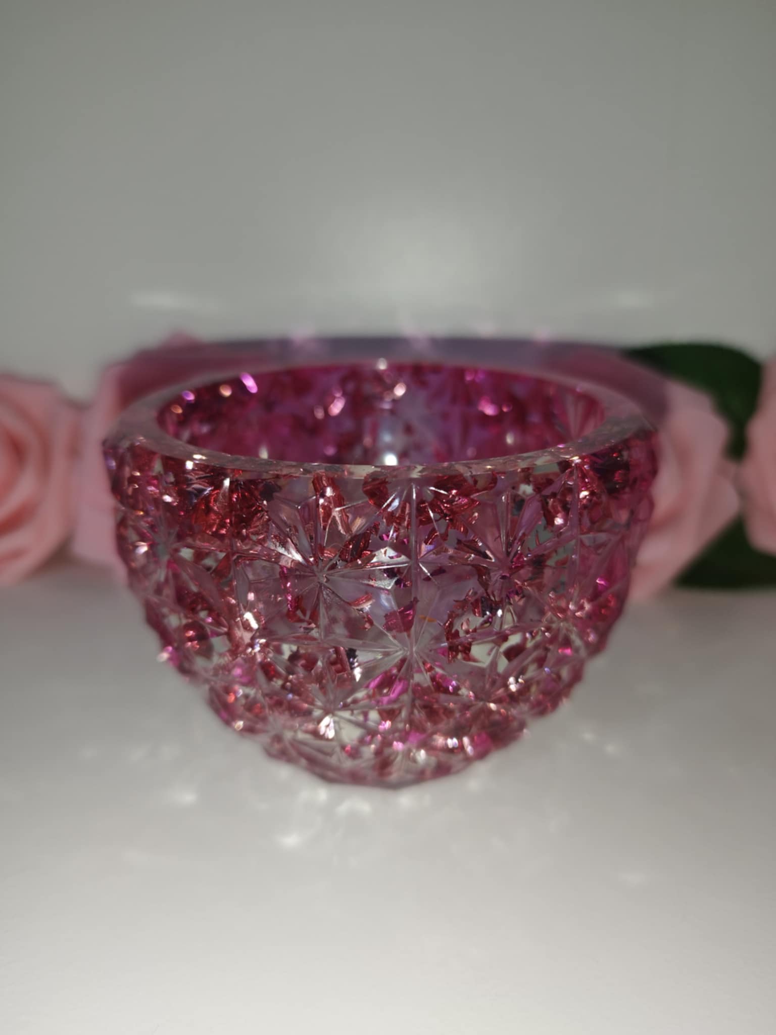 Petit bol en résine époxy effet cristal, feuilles rose.