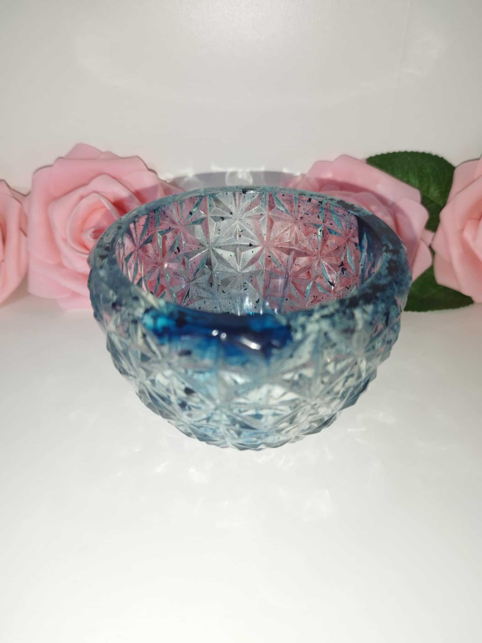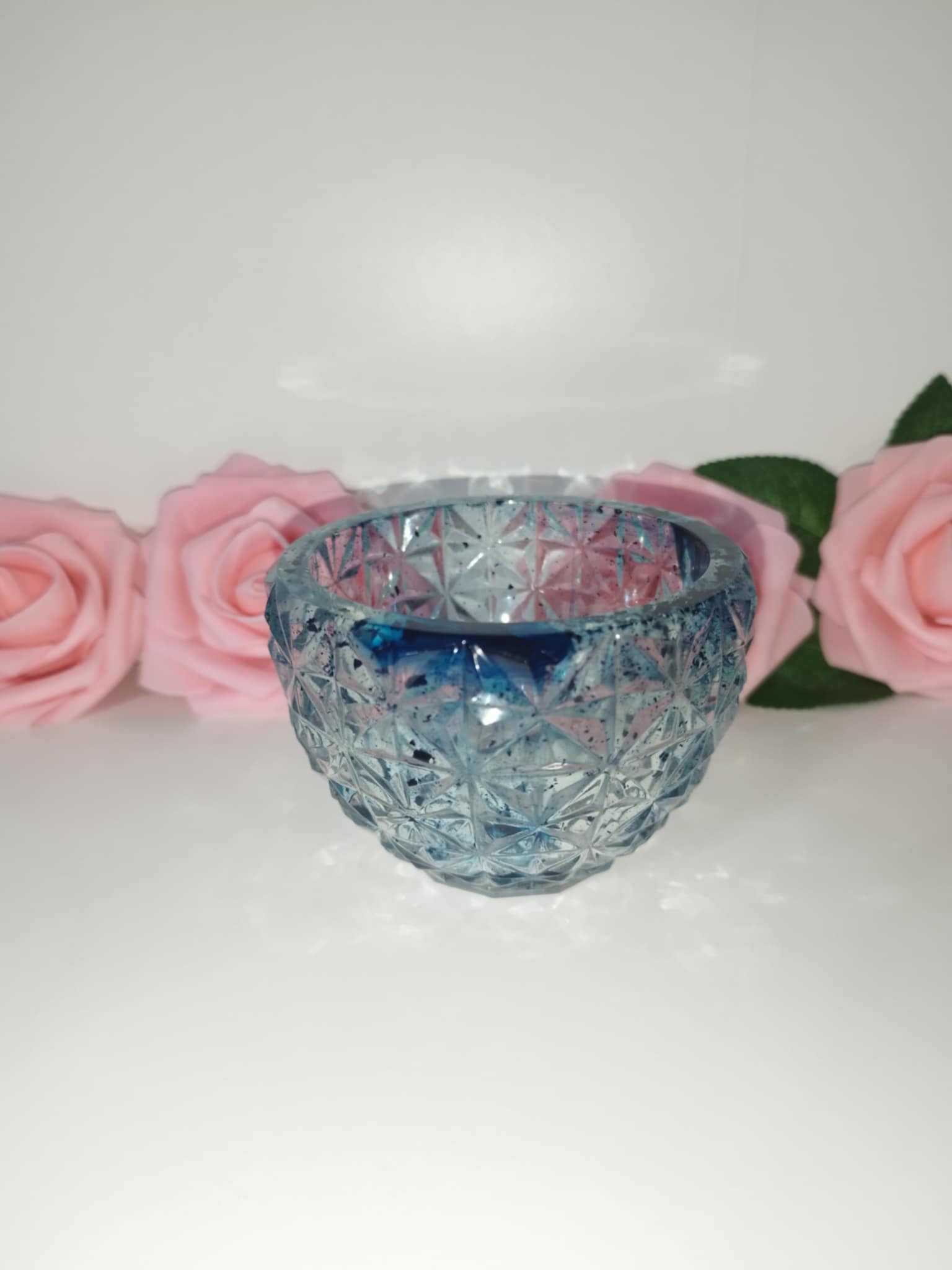 Petit bol en résine époxy effet cristal, moucheté bleu sombre.